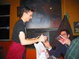 After the Linuxfest, many people headed across the street for pizza, drinks, and of course free swag! Here's Arno getting ready to give out a bunch of Revolution OS DVDs and books. |